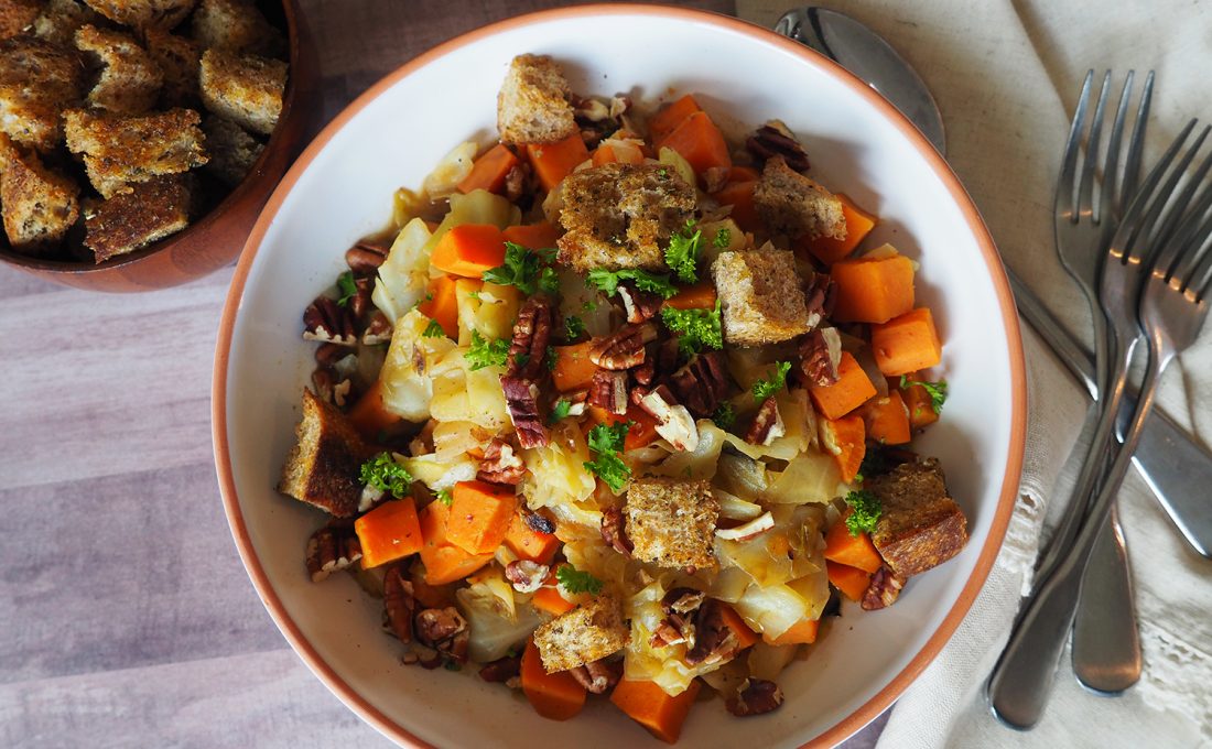 Braised Cabbage & Sweet Potatoes with Sage Croutons