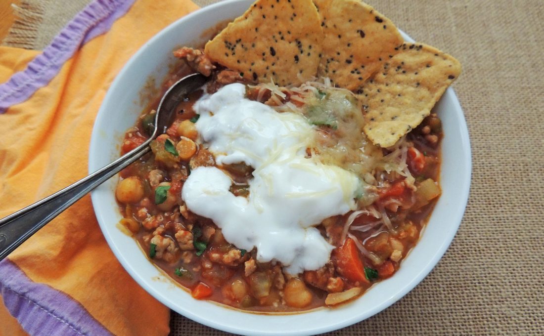 Alliteration aside, chicken chickpea chili is easy to make and you can add/subtract ingredients at will.