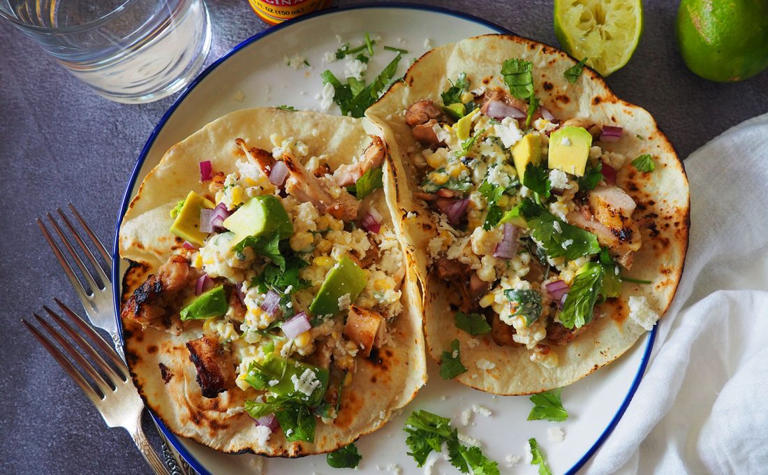 Zesty lime-marinated chicken combined with a salty/sweet Mexican street corn salad makes the perfect taco filling. Toast up some tortillas, pour a glass of Corona, and you’re all set!