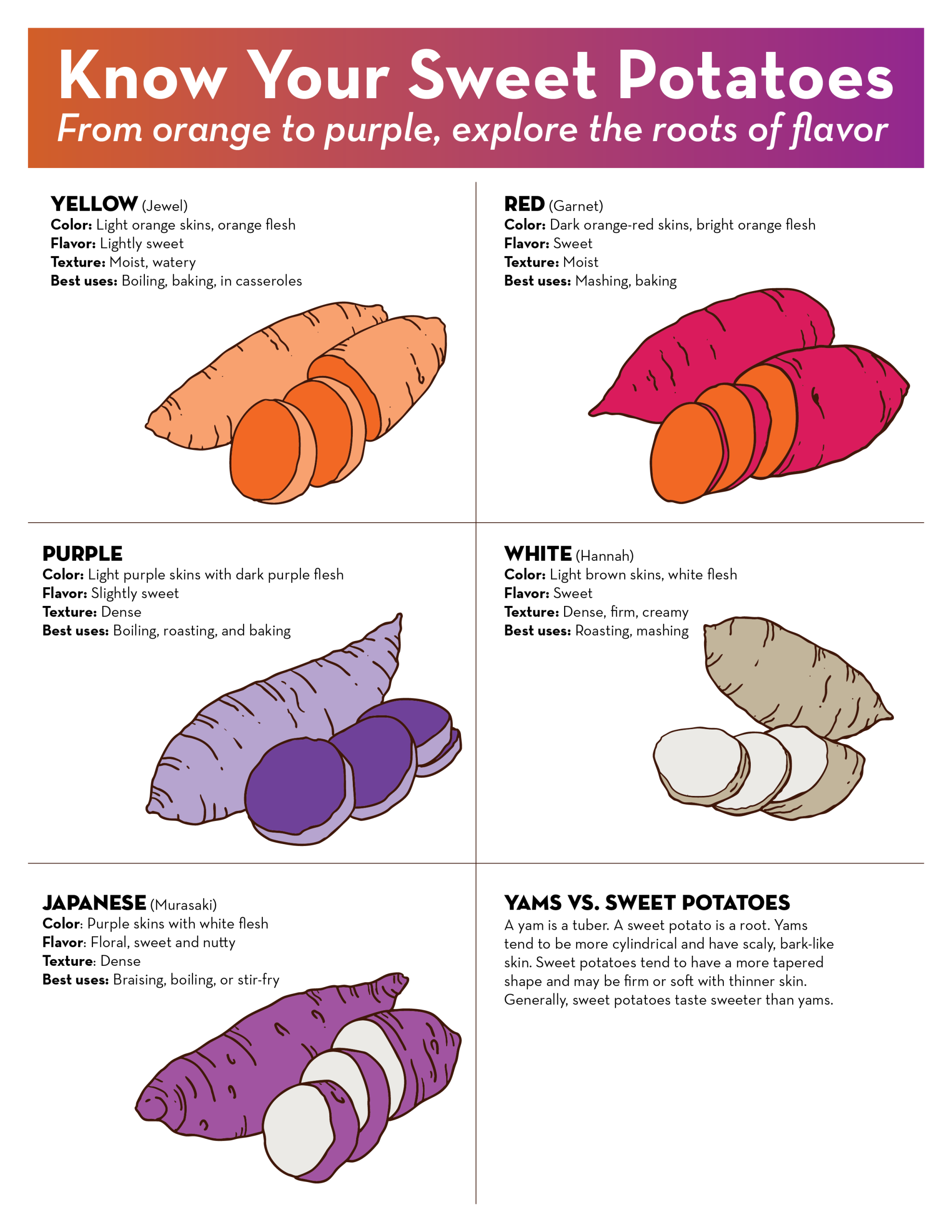 Sweet taters, dessert tubers, sweeter-than-you potatoes, sugar spuds, or sassy dirt queens. No matter what you call them, sweet potatoes come in a variety of flavors and colors that we believe everyone should know about. Enjoy this simple field guide to everyone’s favorite fall holiday potato.