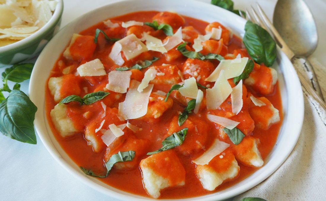 This is the easiest homemade pasta or dumpling you can make, no special skills or equipment required. The sauce has a light touch and doesn’t overwhelm with heavy tomatoey-ness.