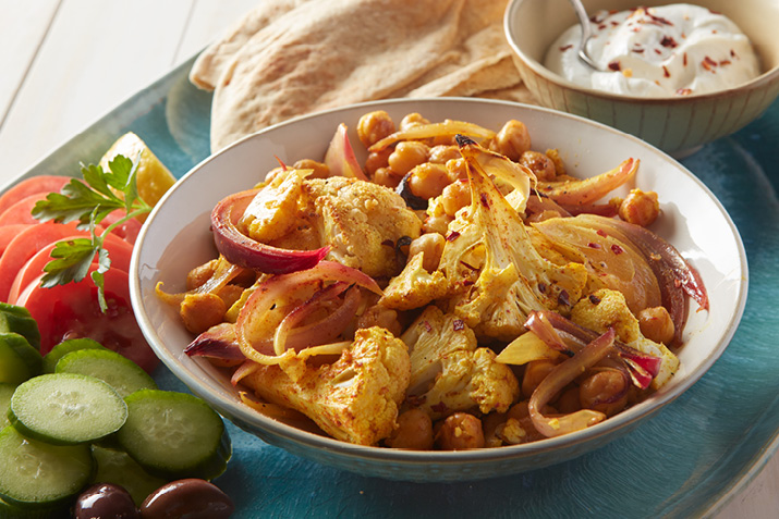 Recipe courtesy of: Co+op Recipe Information Total Time: 35 minutes; 10 minutes active Servings: Serves Six If you’ve ever had shawarma, this may taste familiar to you. Instead of meat, this dish relies on cauliflower and chickpeas. The spice combination makes