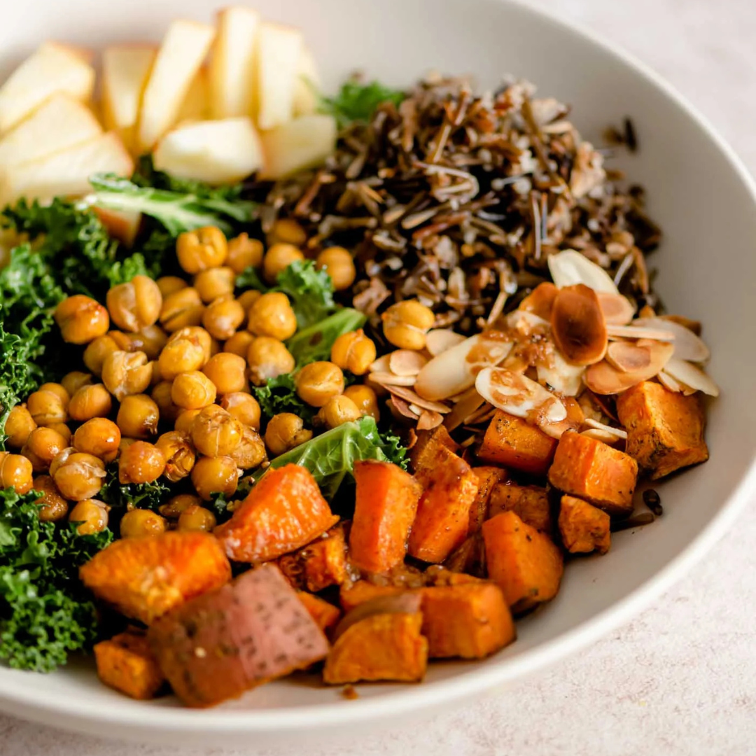 Celebrate the flavors of fall with this harvest bowl a hearty mix of roasted chickpeas, caramelized sweet potatoes, crisp apple, and nutty wild rice, all tossed with massaged kale and a tangy balsamic dressing. It’s wholesome, colorful, and perfect for meal prep or a quick, nourishing dinner after a busy day.