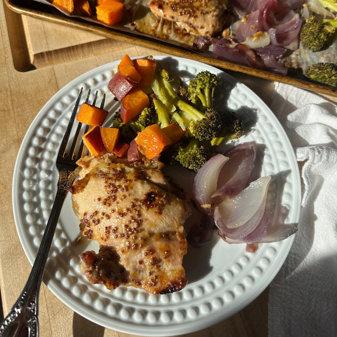 As the school year kicks into gear and the evenings turn crisp, this Honey Mustard Chicken Sheet Pan Dinner makes weeknight cooking effortless. Juicy chicken thighs, sweet potatoes, and vibrant broccoli roast together under a tangy-sweet honey mustard glaze for a nourishing meal that’s on the table in about 35 minutes. Minimal prep, one pan, and cozy fall flavors, perfect for busy nights when you still want something wholesome and homemade.